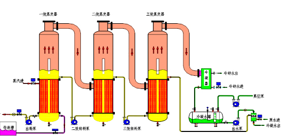 1、一效加熱器 2、二效加熱器 3、三效加熱器 4、一效分離器 5、二效分離器 6、三效分離器 7、預熱器 8、冷凝器 9、冷水罐