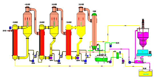 1、一效加熱分離器 2、二效加熱分離器 3、三效加熱分離器 4、預熱器 5、冷凝器 6、冷水罐
