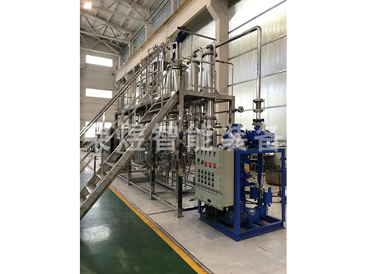 結(jié)構(gòu):本設(shè)備主要包括薄膜蒸發(fā)器、內(nèi)置冷凝器、二級(jí)冷凝器、原料罐、成品罐、低沸點(diǎn)罐、高沸點(diǎn)罐等部件組成,全部由不銹鋼制造。